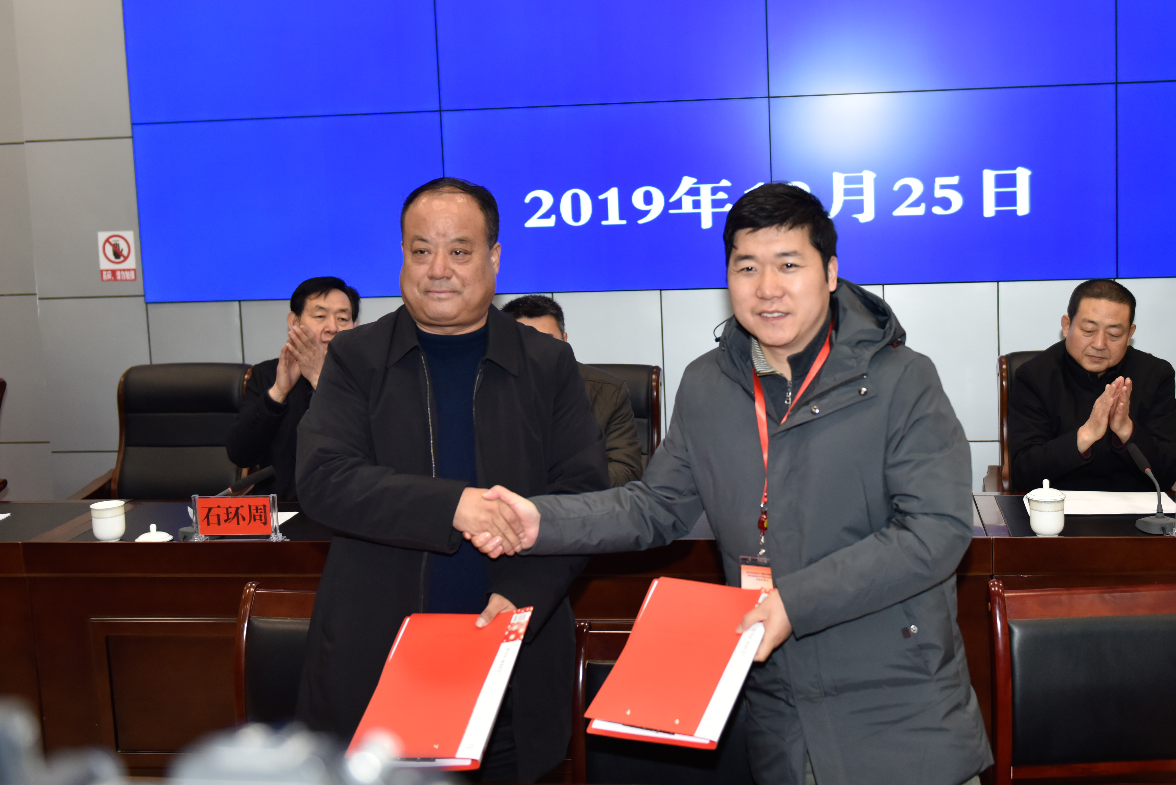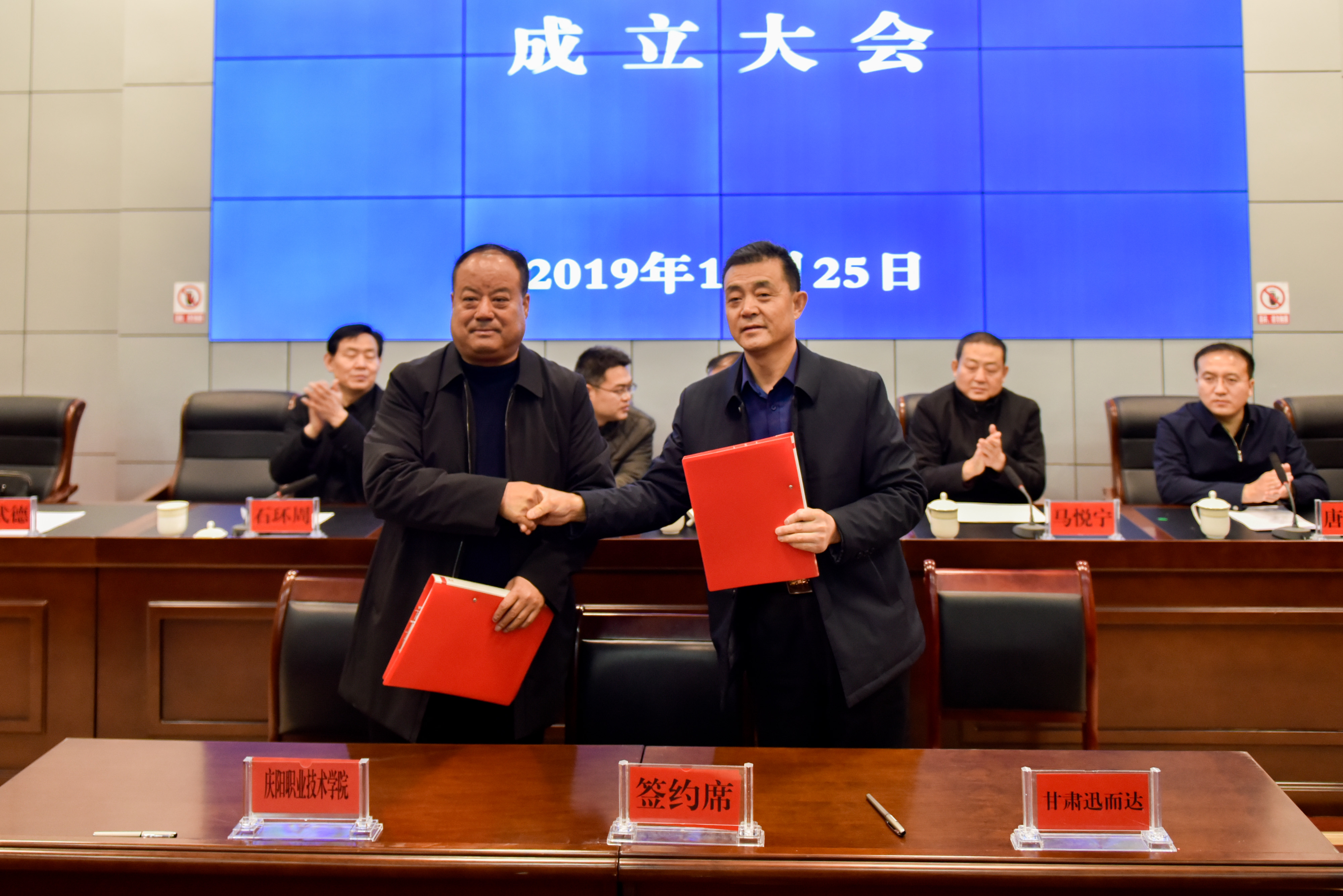 庆阳职业技术学院院长张武德与学校代表、企业代表签订校校合作、校企合作协议。