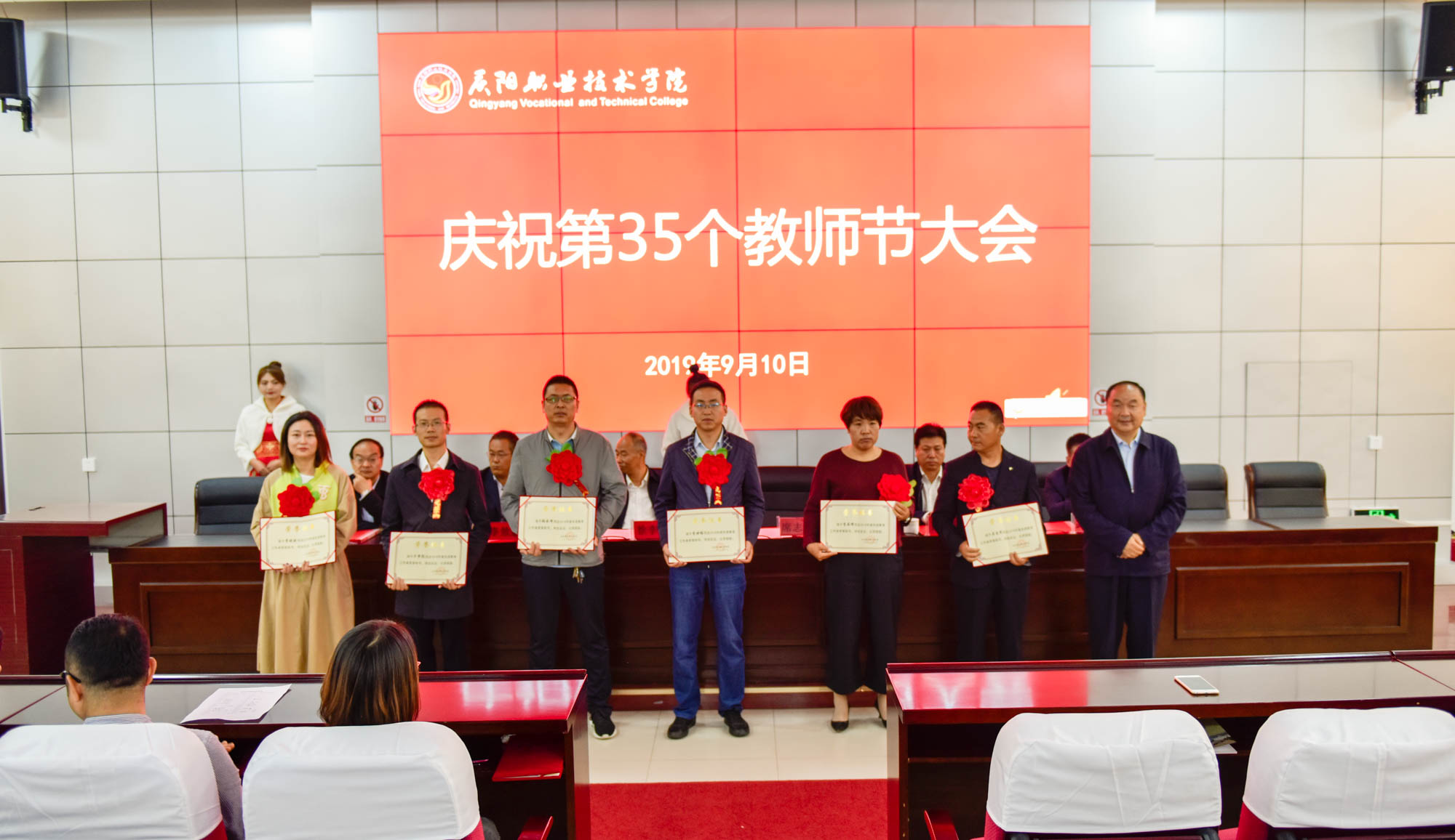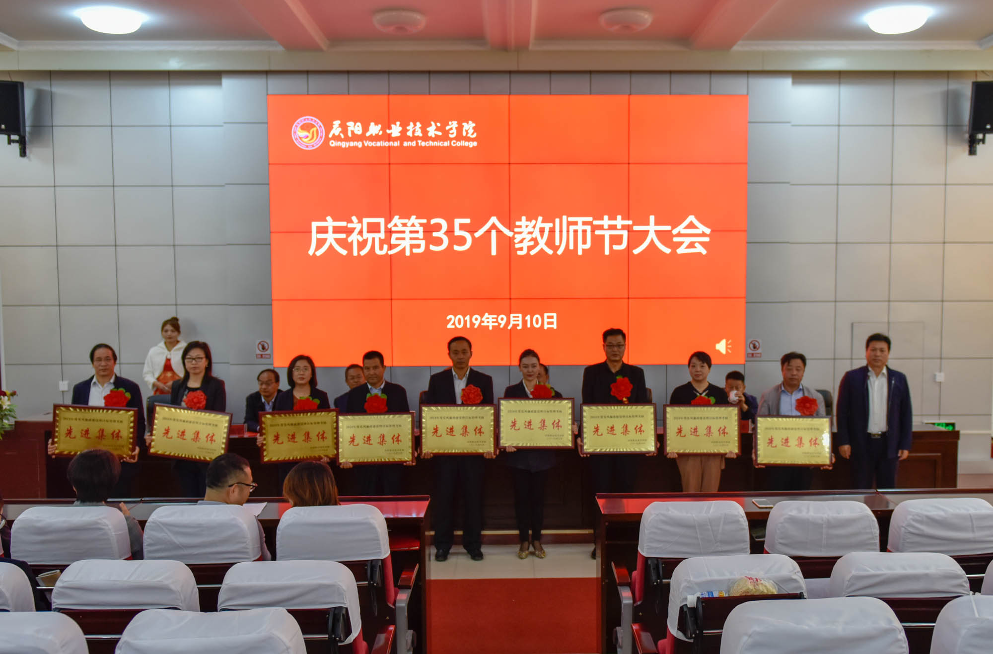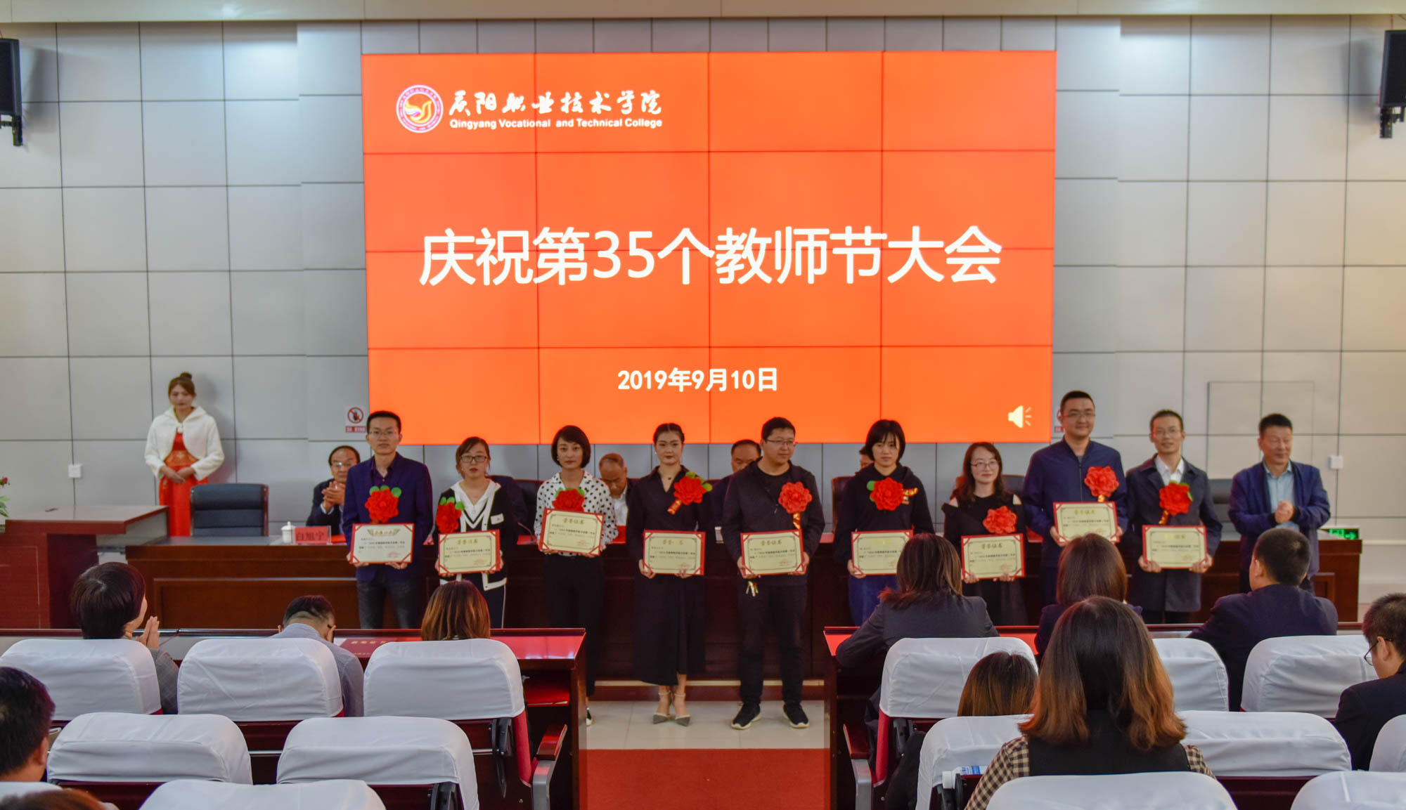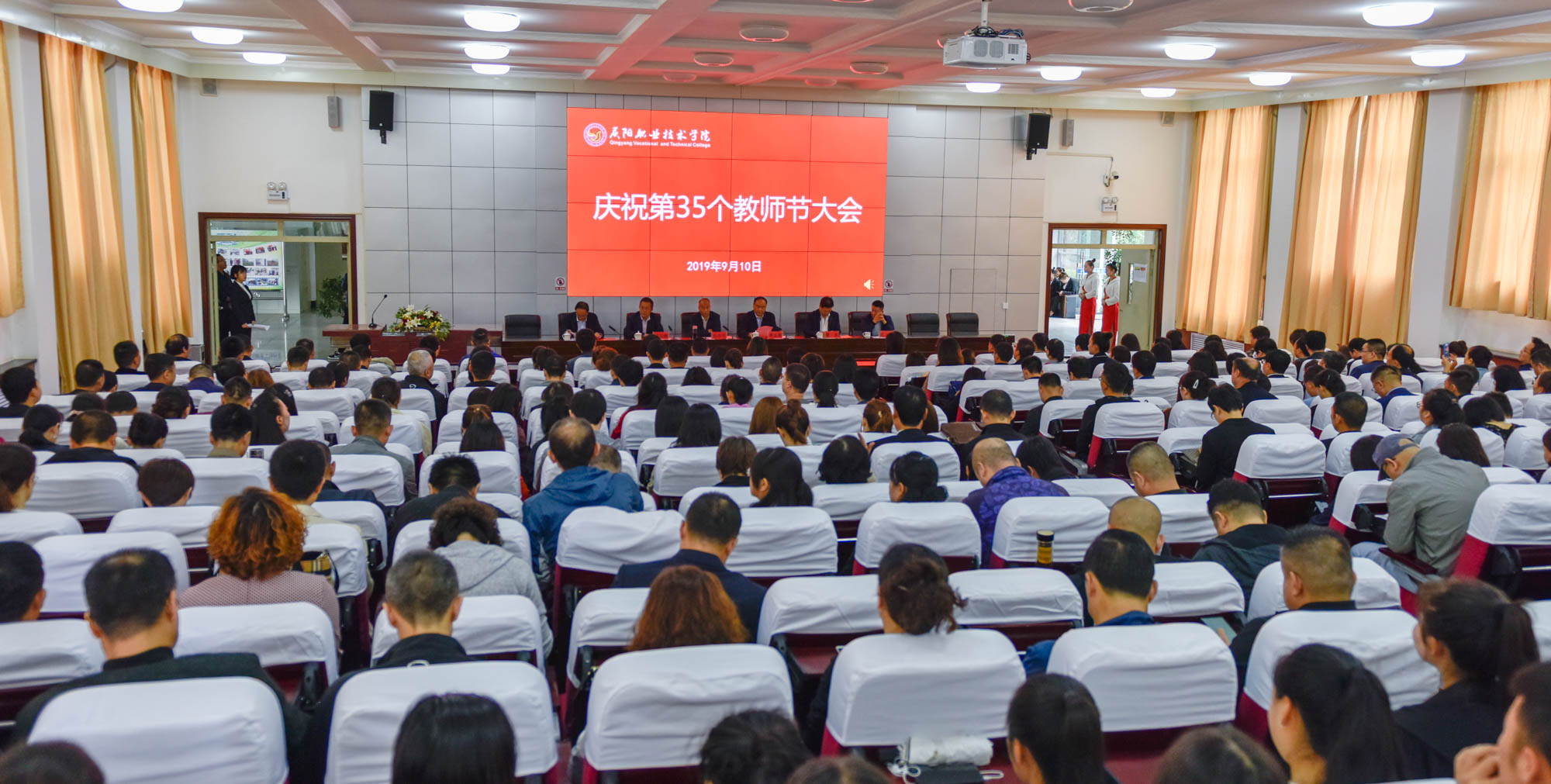 在喜迎中秋寄相思,普天同庆迎华诞之际,9月10日,庆阳职业技术学院在多媒体报告厅召开庆祝第35个教师节大会,表彰奖励在教育教学工作中涌现出的模范教师和先进集体。学院领导班子成员,全体教职工及学生代表共350余人参加。大会由院长席志慧主持。
