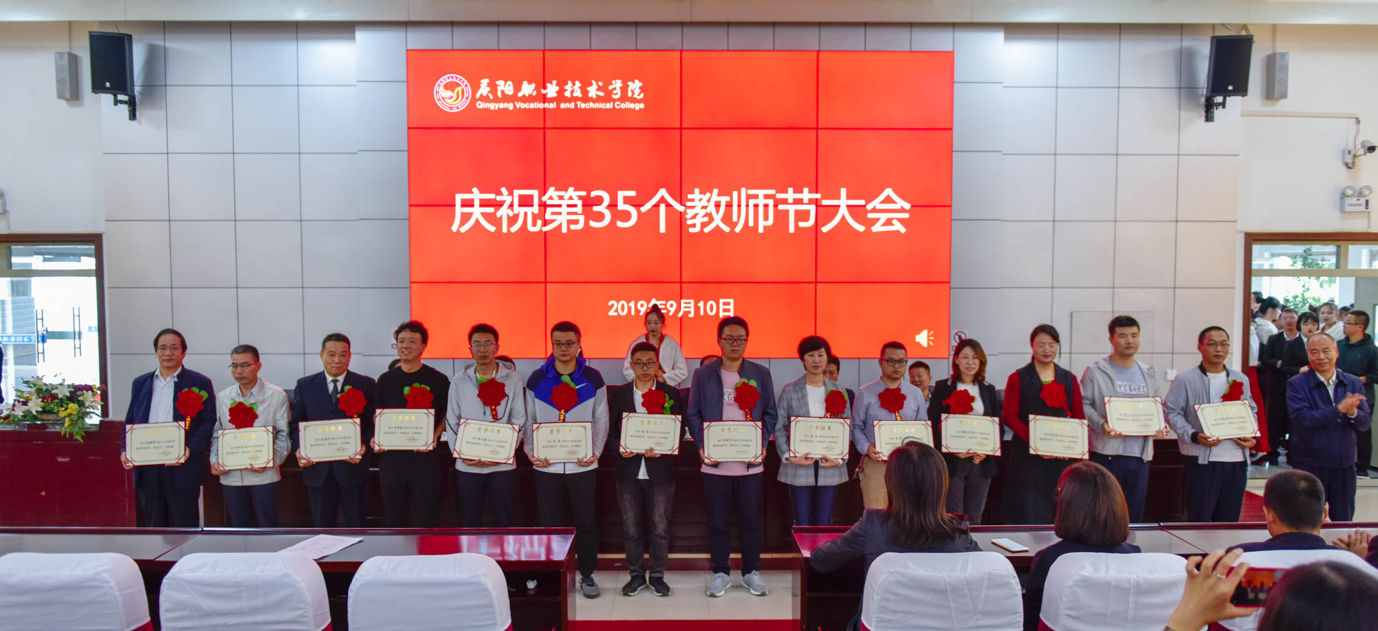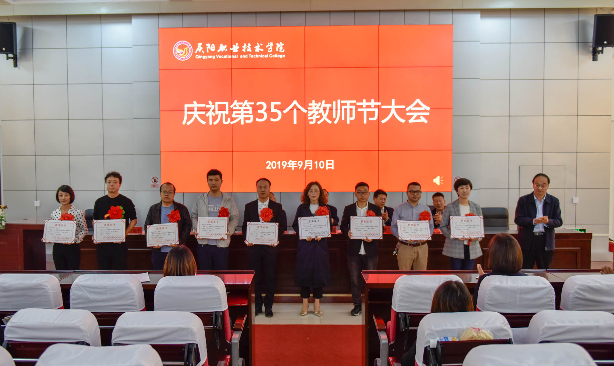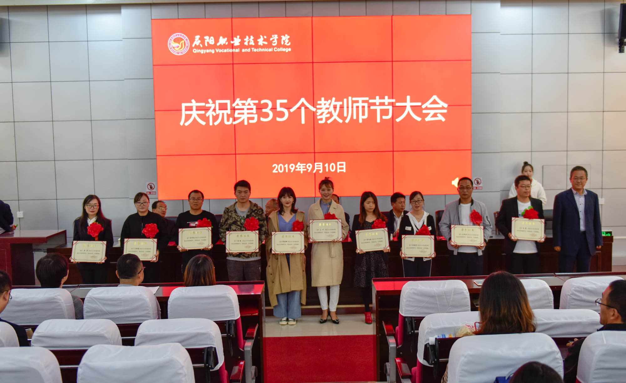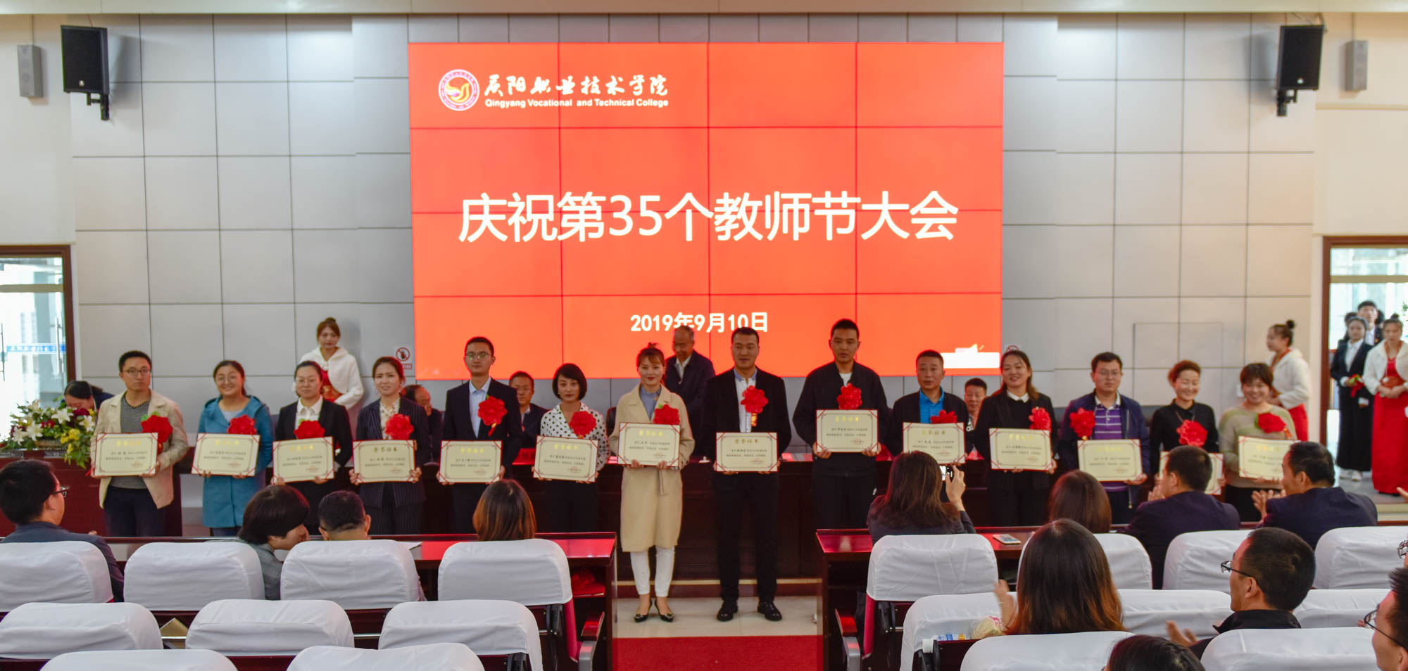 在喜迎中秋寄相思,普天同庆迎华诞之际,9月10日,庆阳职业技术学院在多媒体报告厅召开庆祝第35个教师节大会,表彰奖励在教育教学工作中涌现出的模范教师和先进集体。学院领导班子成员,全体教职工及学生代表共350余人参加。大会由院长席志慧主持。