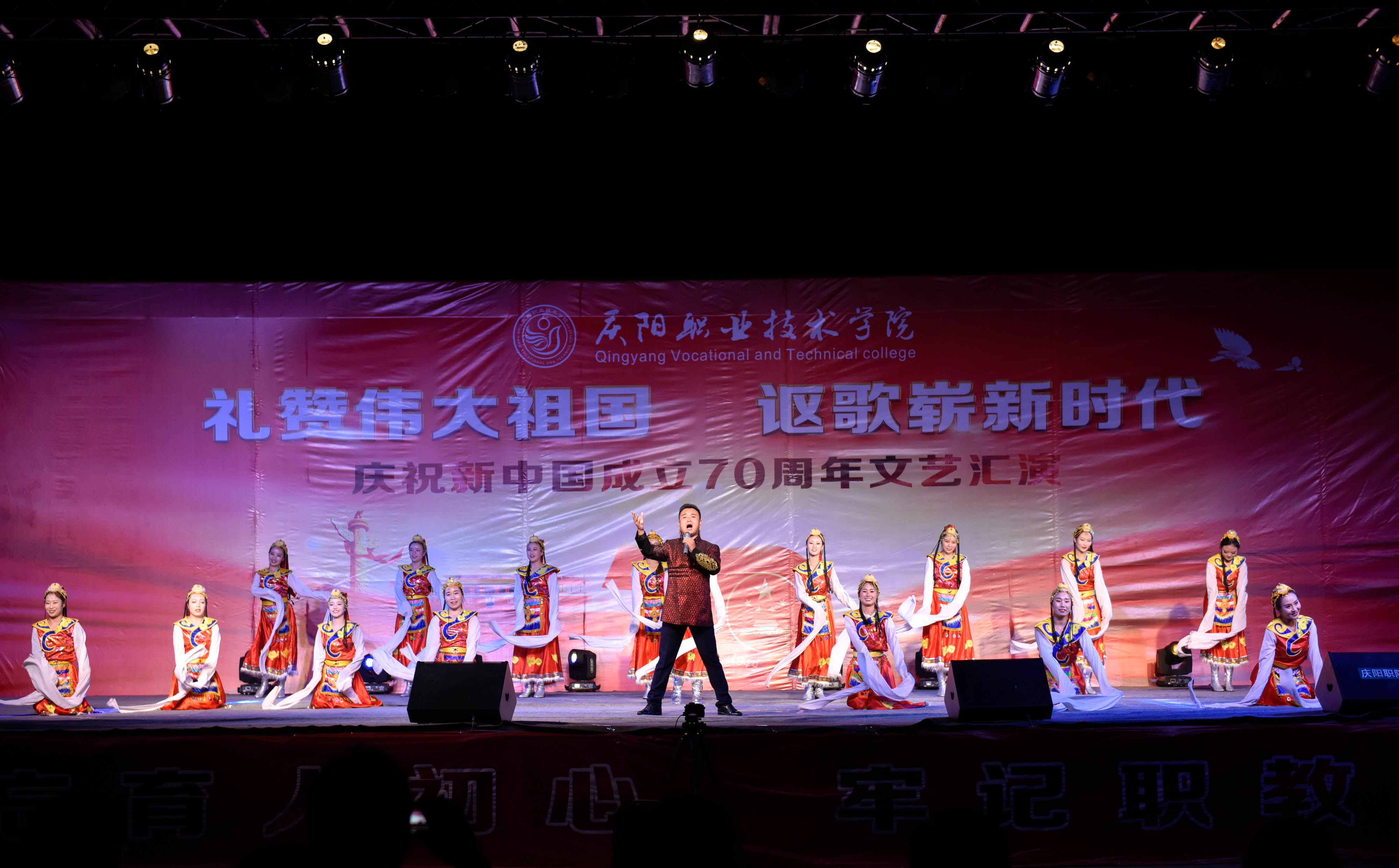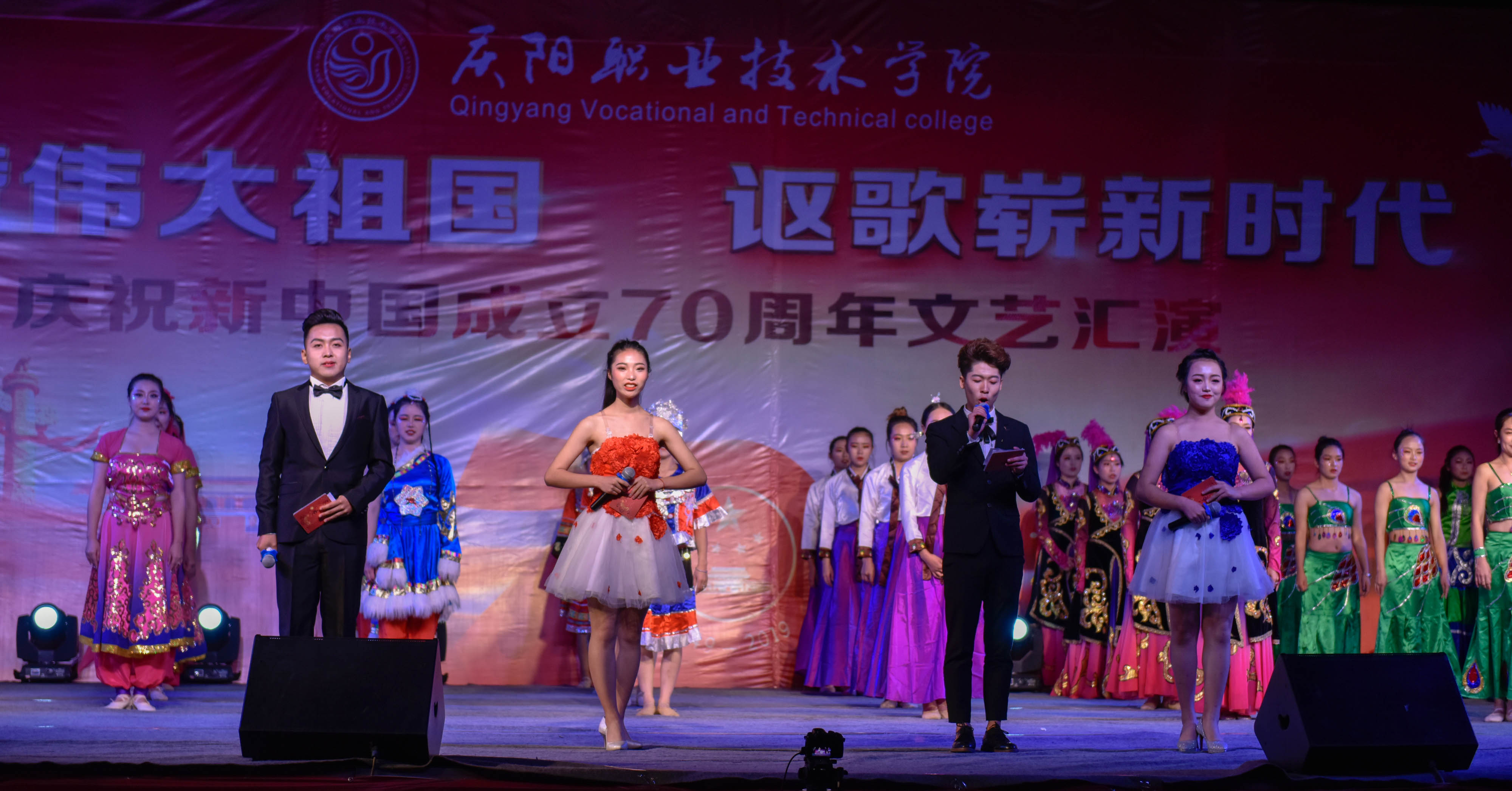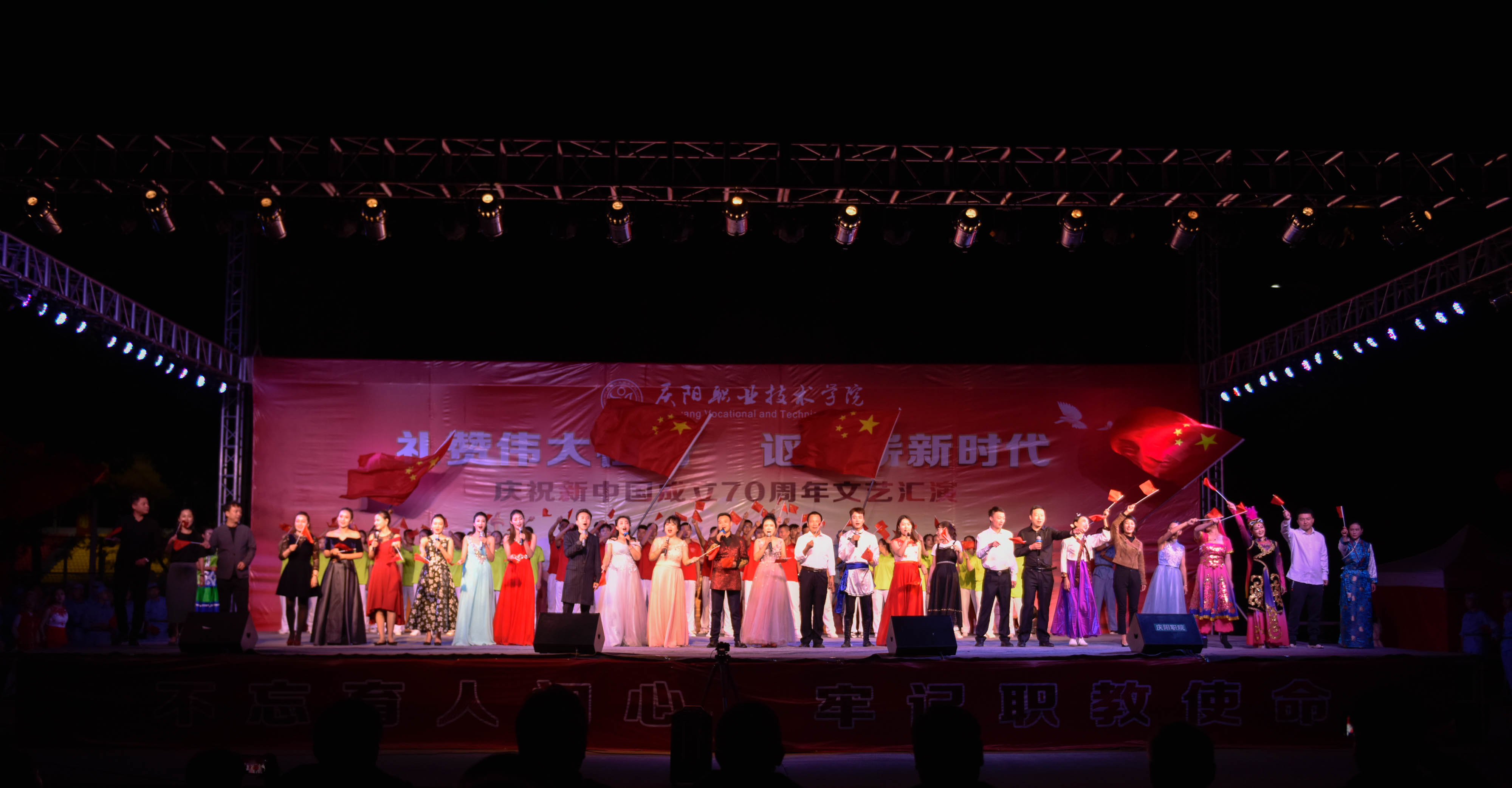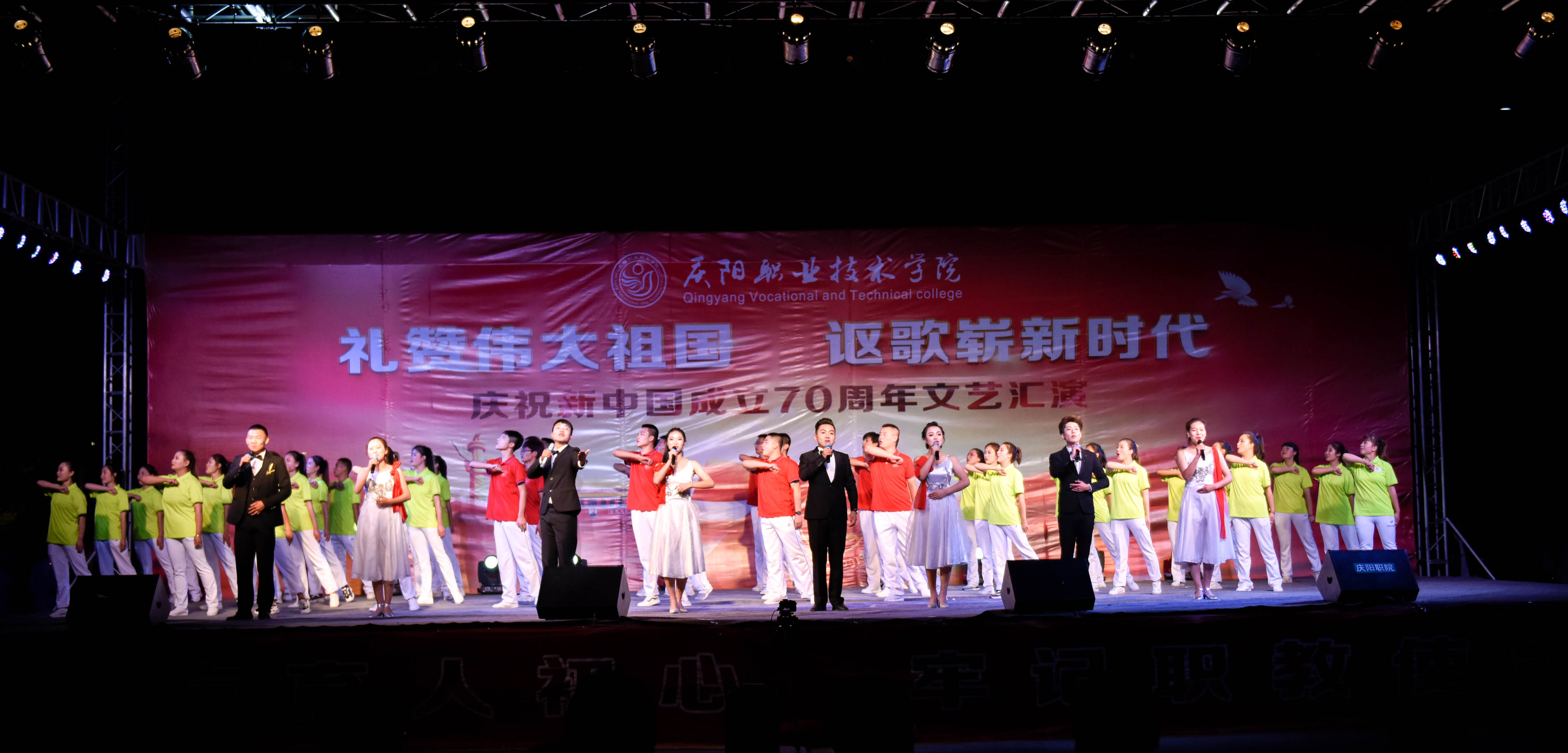 为庆祝新中国成立70周年,弘扬爱国主义为核心的伟大民族精神,激发师生爱党、爱国、爱校情怀,展现我院美育教育教学成果,引导2019级新生尽快适应大学学习生活,9月25日晚,学院在篮球场举办庆祝新中国成立70周年文艺汇演。