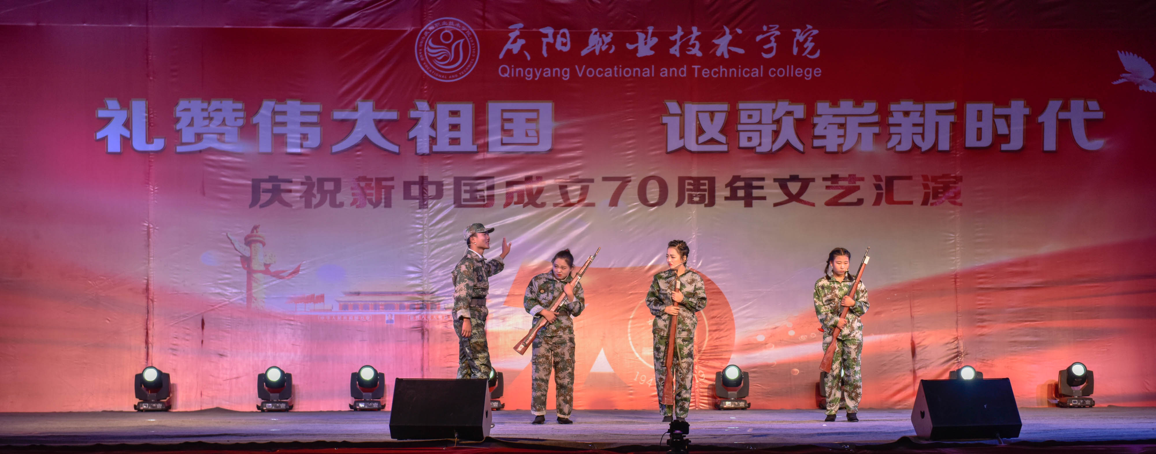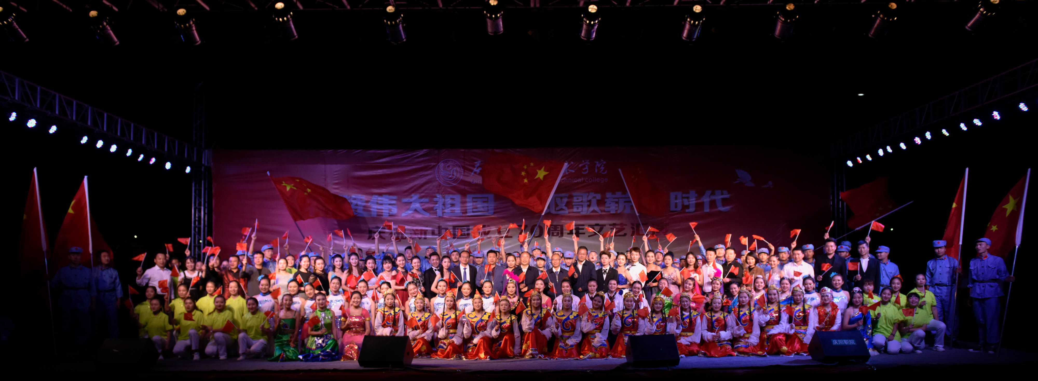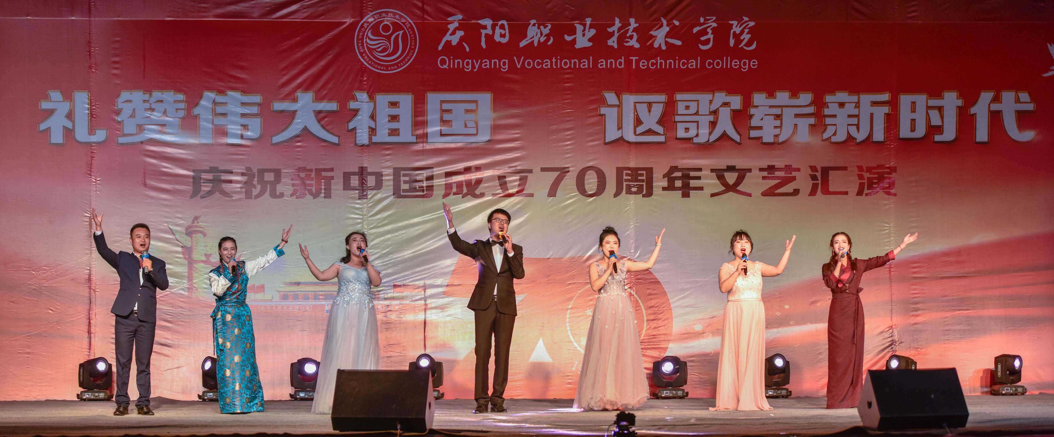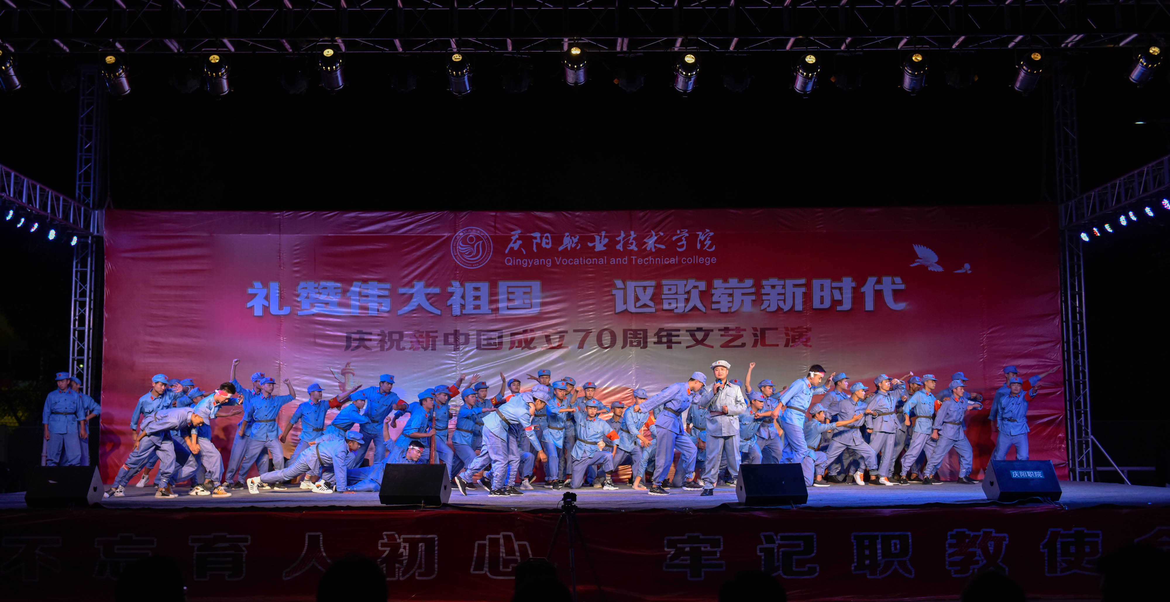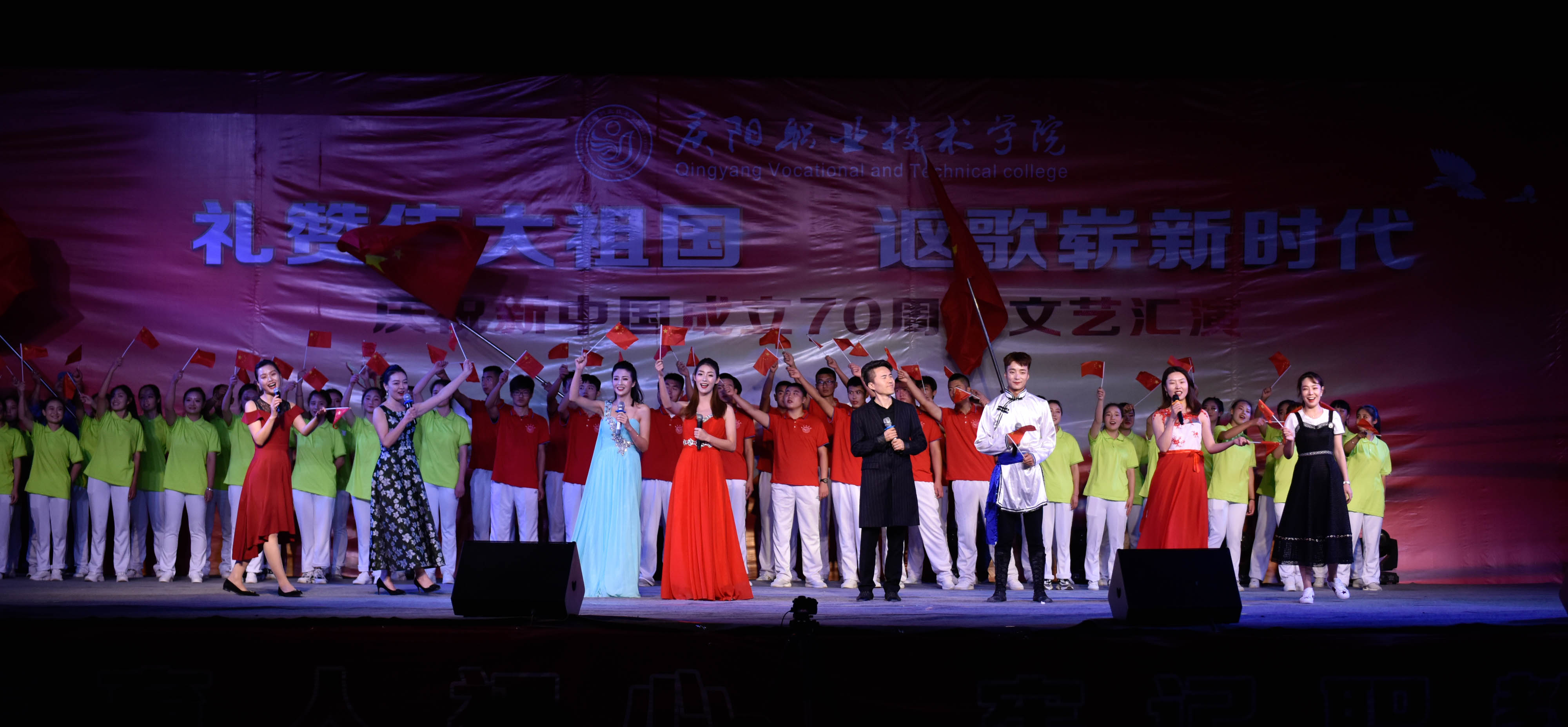 为庆祝新中国成立70周年,弘扬爱国主义为核心的伟大民族精神,激发师生爱党、爱国、爱校情怀,展现我院美育教育教学成果,引导2019级新生尽快适应大学学习生活,9月25日晚,学院在篮球场举办庆祝新中国成立70周年文艺汇演。