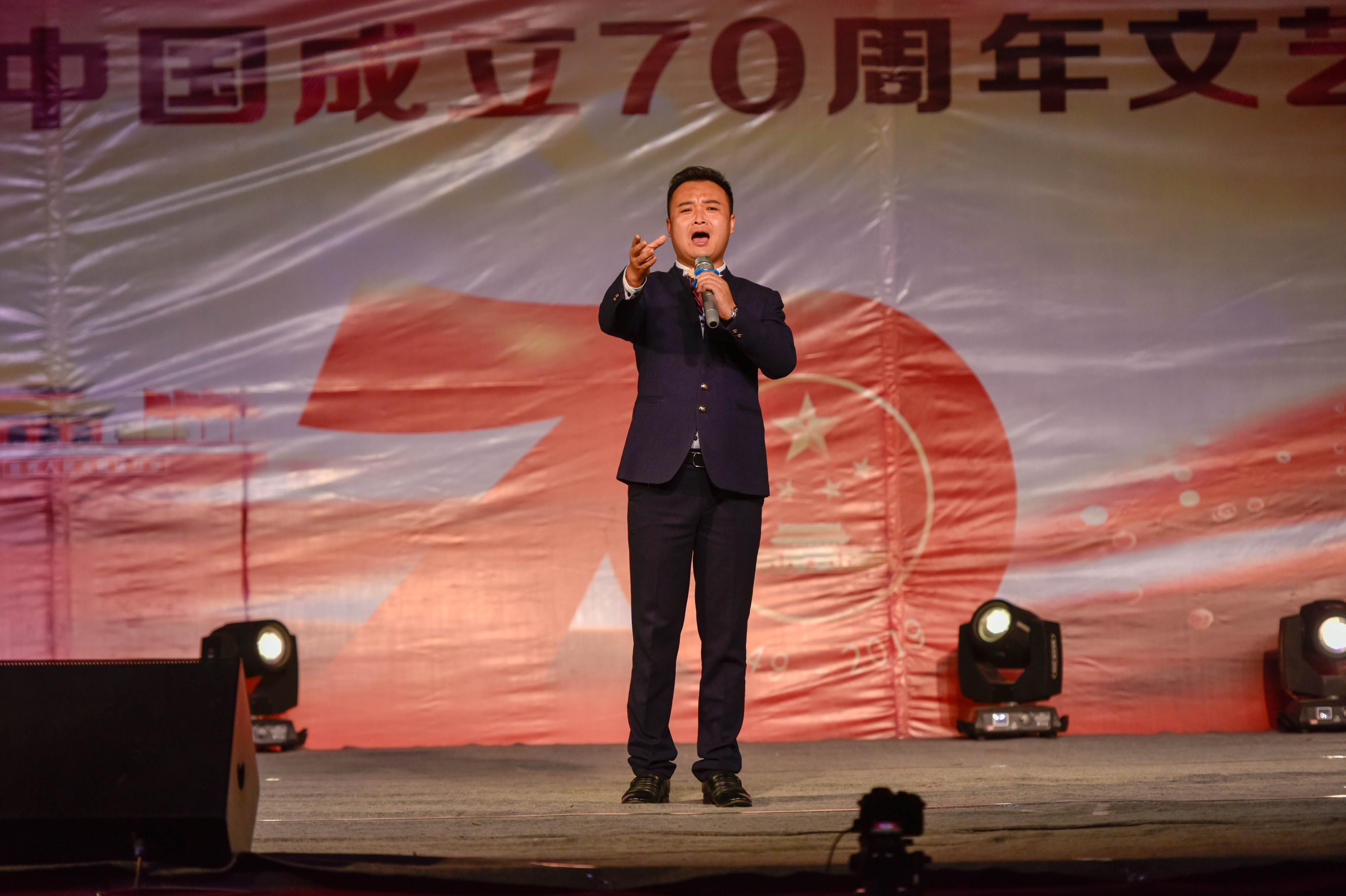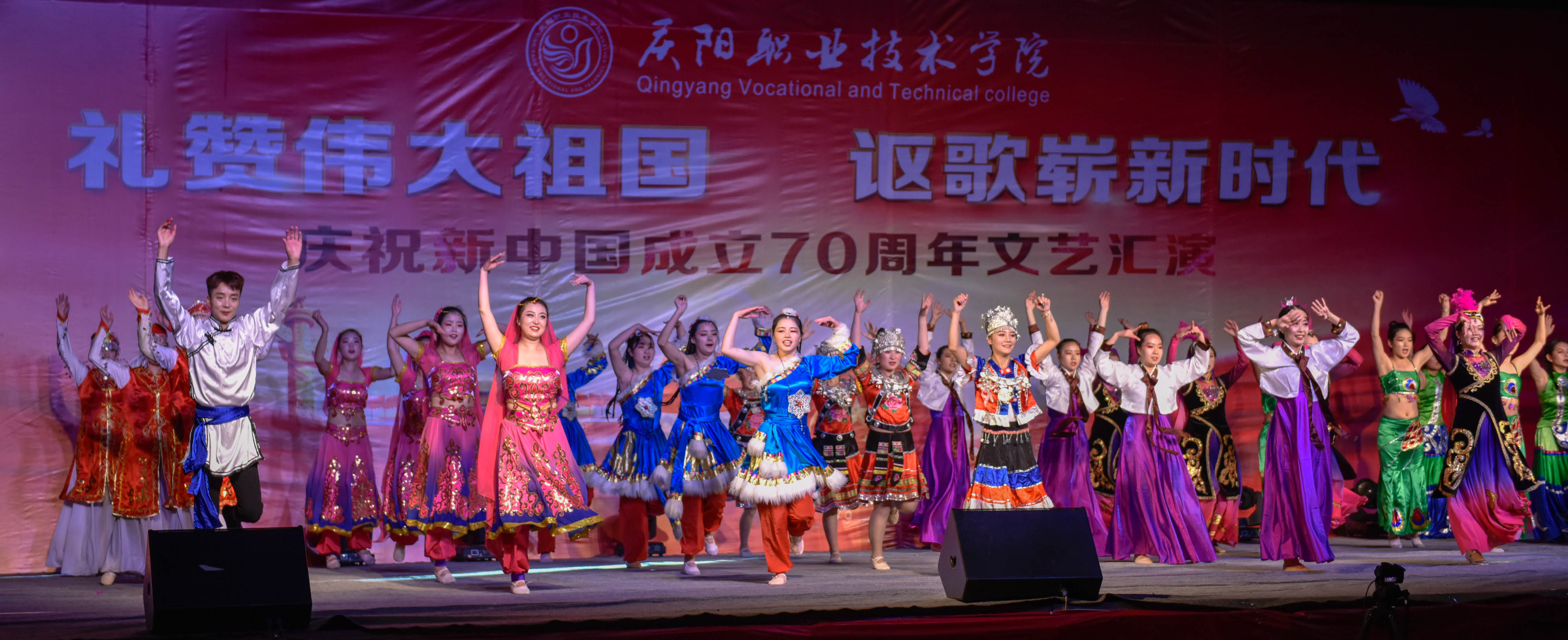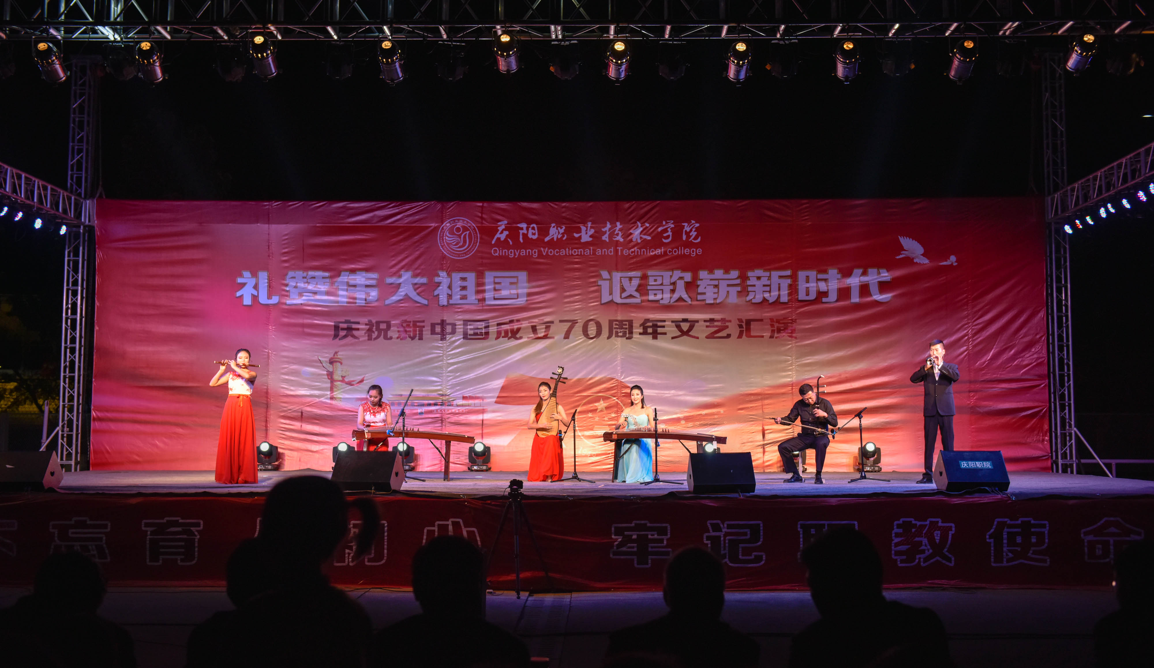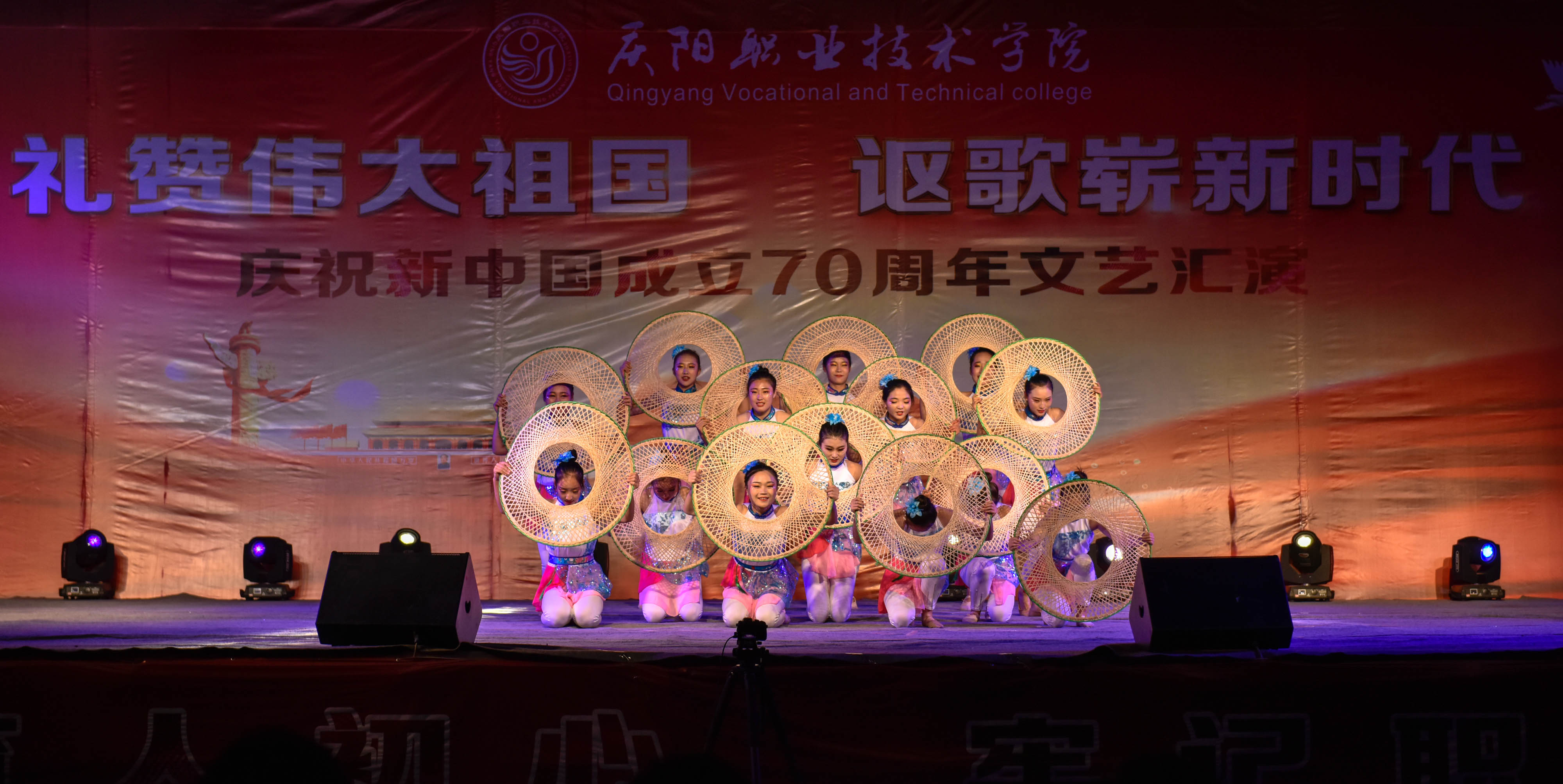 为庆祝新中国成立70周年,弘扬爱国主义为核心的伟大民族精神,激发师生爱党、爱国、爱校情怀,展现我院美育教育教学成果,引导2019级新生尽快适应大学学习生活,9月25日晚,学院在篮球场举办庆祝新中国成立70周年文艺汇演。