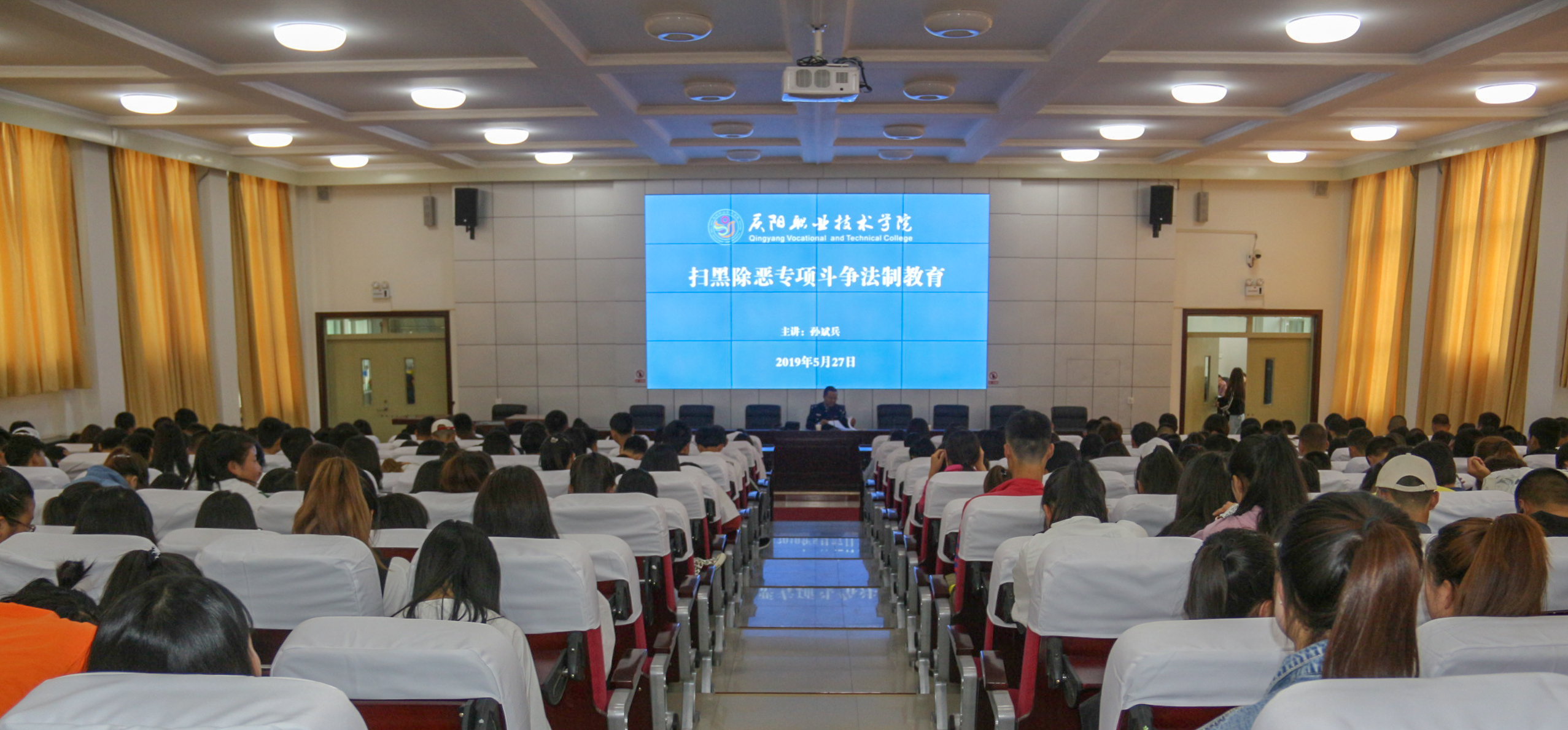 为进一步深化扫黑除恶专项斗争和法制教育工作,让法制知识走进校园,增强学生的法制意识,加强和谐平安校园建设,防范校园暴力,拒绝不良诱惑。5月27日下午,学院在多媒体报告厅举行“扫黑除恶”专项斗争法制知识宣讲报告会。后官寨派出所政法干警孙斌斌、学院学生工作处、保卫处负责同志及师生代表350余人参加会议。