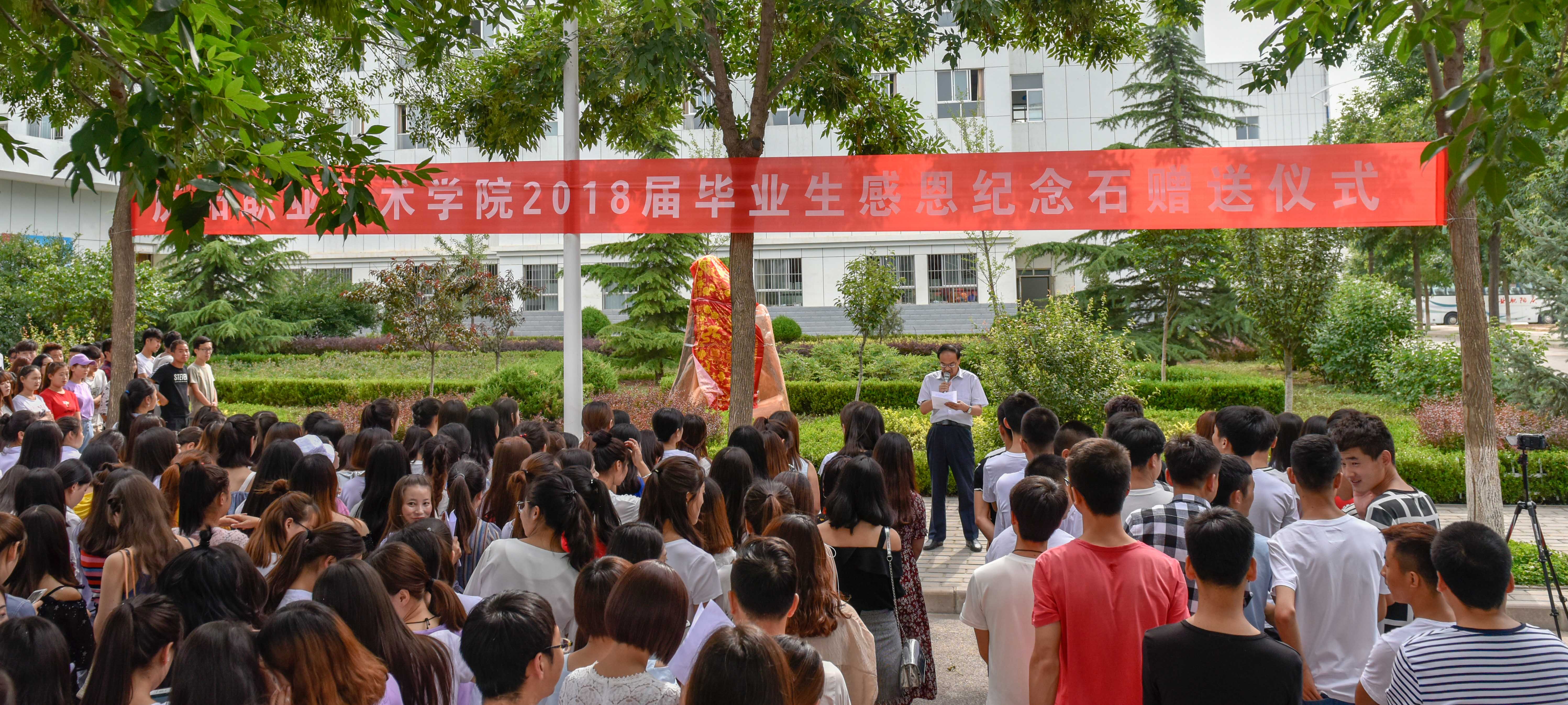 “昔我来思,桃李累累;今我往矣,杨柳依依”。为表达感恩和纪念这一良好的意愿,6月29日上午,庆阳职业技术学院2018届毕业生感恩纪念石赠送仪式在学院隆重举行。学院党委书记徐李平,院长席志慧,副院长曹强、武卫东和全体中层干部、班主任及2018届全体毕业生、团学干部代表800多人参加赠送仪式。仪式由副院长白旭宁主持。