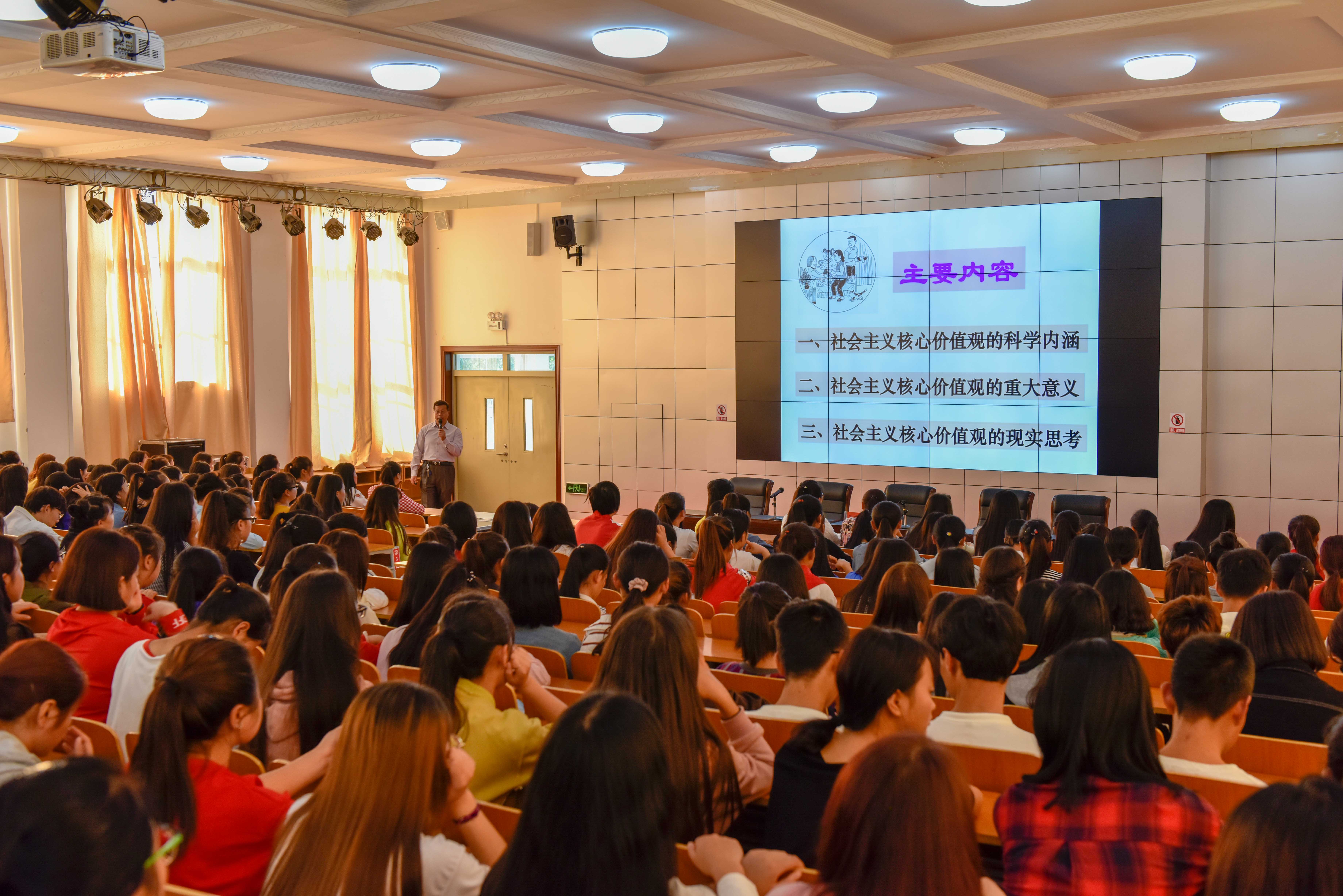 为学习贯彻全国教育大会精神,加强和改进思政教育工作,落实立德树人根本任务,做好对社会主义核心价值观的解读和宣讲,9月12日下午,学院在多媒体报告厅举行第十四期“庆阳职院大讲堂”,邀请庆阳职业技术学院副教授、庆阳讲师团成员许旭辉作了题为《学习社会主义核心价值观 争做有理想有道德的时代新人》的报告。艺术教育系17级学生400余人聆听,学院betway必威官方网站app部副部长王晓文主持。