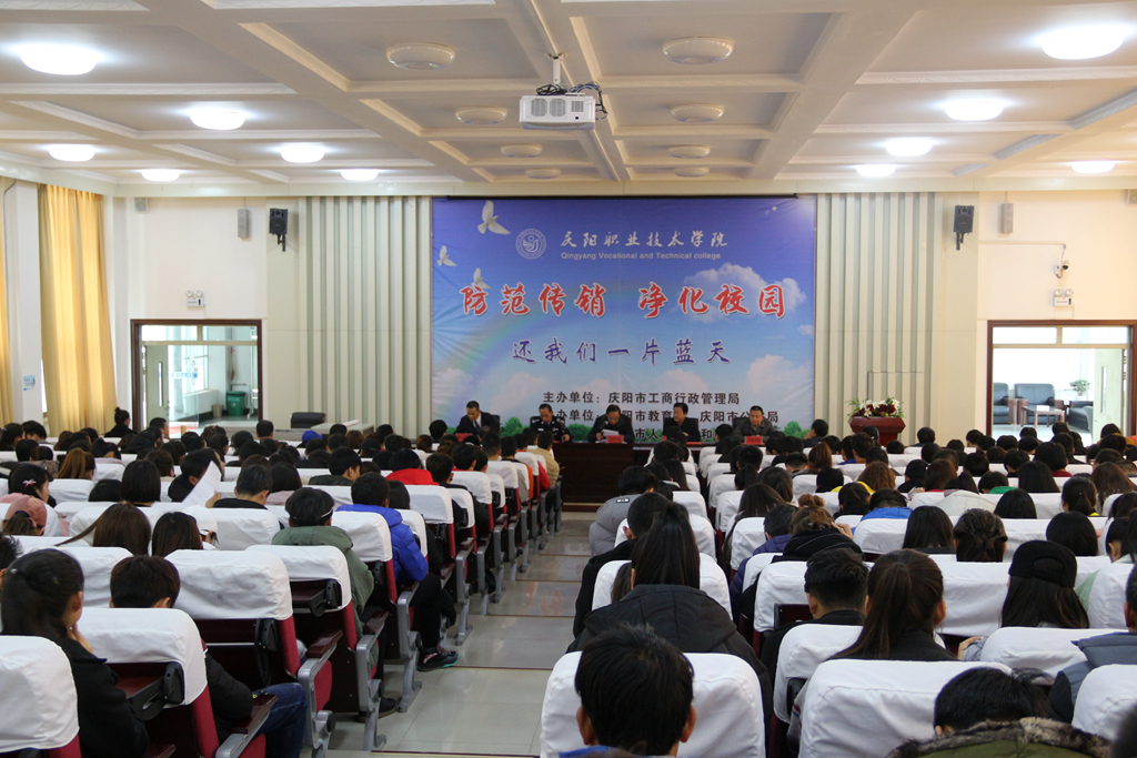 11月24日下午,庆阳市“防范传销净化校园”专项整治活动启动仪式,在庆阳职业技术学院北多媒体报告厅举行。市工商局、教育局、公安局、人社局和庆阳职业技术学院的有关领导、学院相关部门负责人、班主任和团学干部共 400余人参加了启动仪式。市公安局经侦支队政委杨建勇同志主持会议。