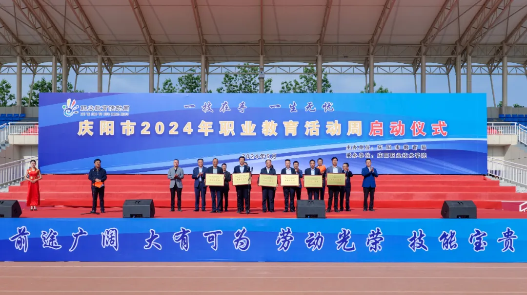 为深入贯彻落实党的二十大精神和习近平总书记关于职业教育的重要指示,大力弘扬劳动光荣、技能宝贵、创造伟大的时代风尚,集中展示全市职业教育改革发展成果,5月10日上午,庆阳市2024年职业教育活动周在学院体育场隆重启动。市政府副市长史建芳出席并宣布活动启动。市政府副秘书长方志杰主持仪式。市教育局主要负责人,市人社局、市工信局、市农业农村局、市总工会、团市委分管负责人,各县(区)教育局负责人,各中职学校校长、市级名师工作室主持人、企业代表及学院在家班子成员、师生代表参加活动。