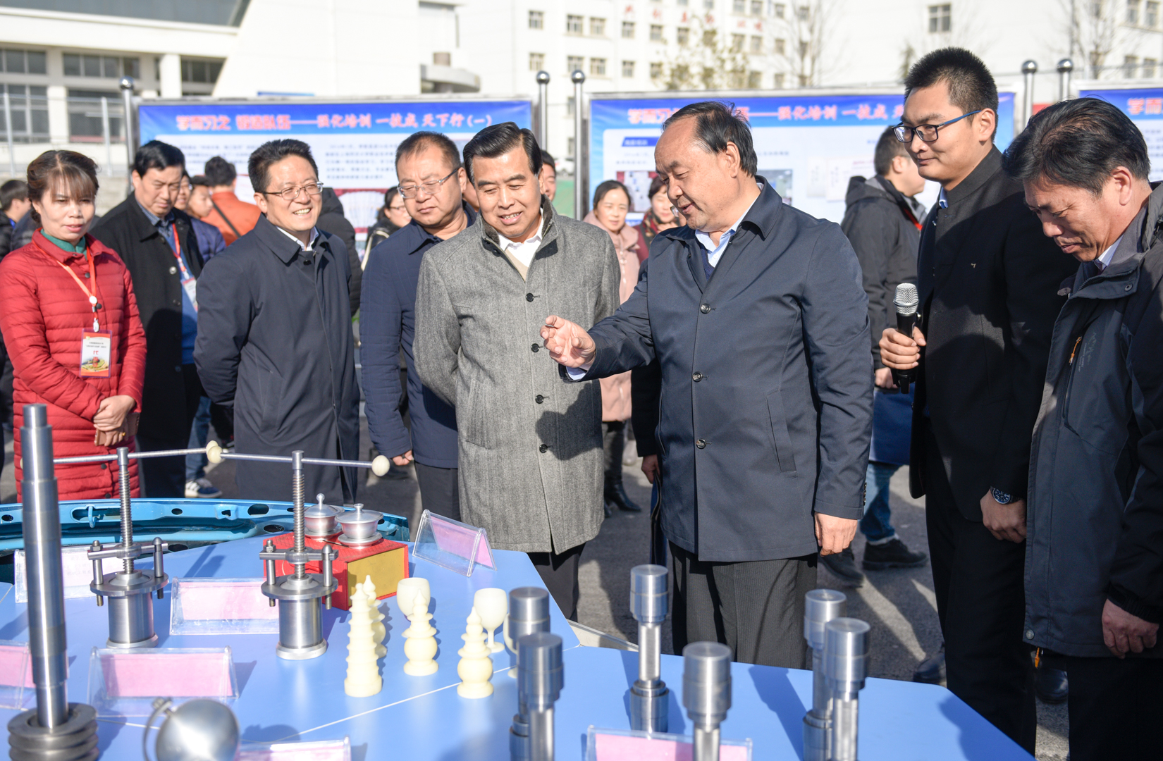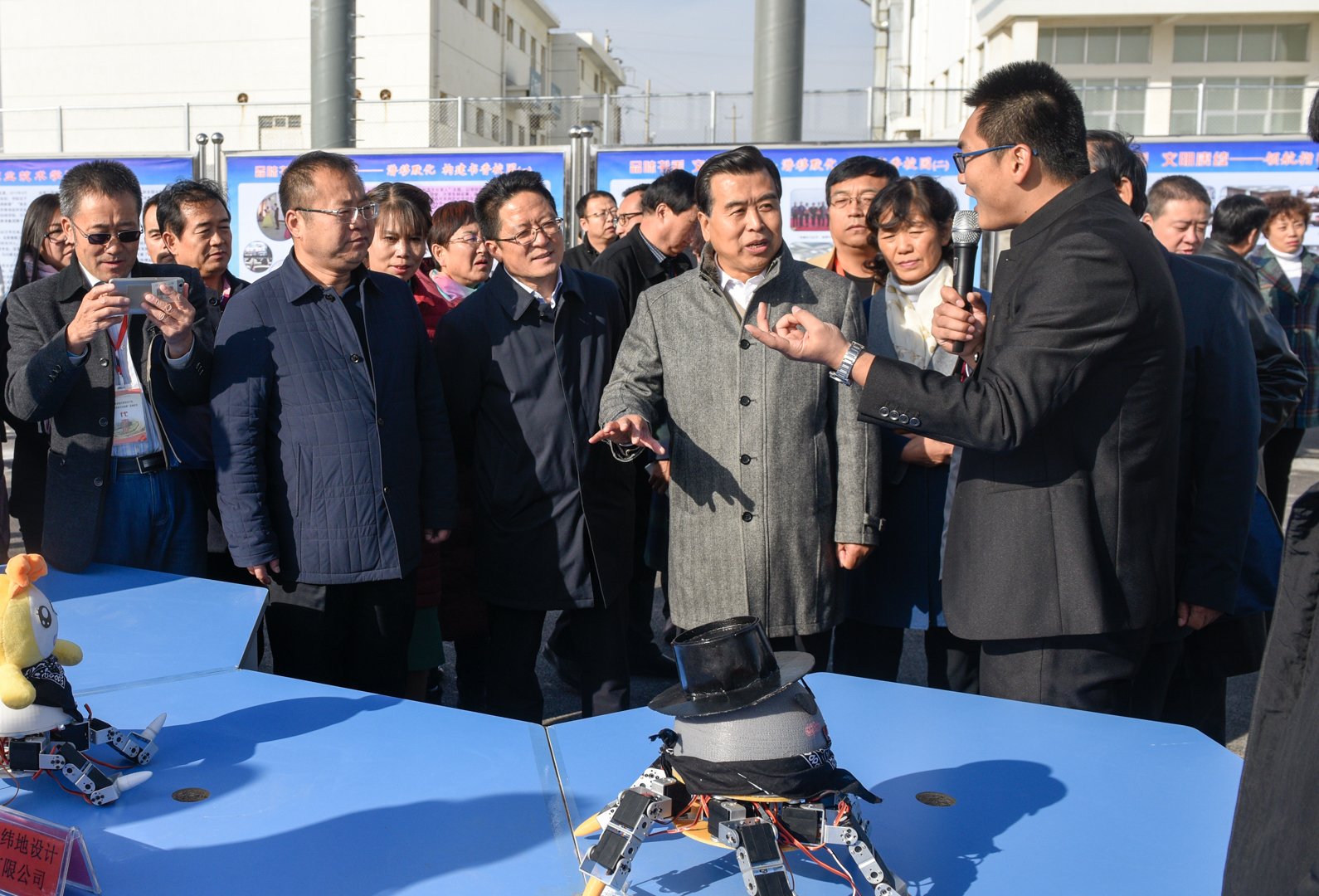 庆阳职业技术学院主展区由“品味书香 文明赓续”“学而习之 锻造队伍”“科研引领 教学相长”“积学储宝 完善自我”“艺文化育 陶情冶性”“知行合一 创新致远”六个板块有机构成,此外,学院师生科研、创新成果有序分列两侧,牢牢吸引了与会代表的目光。特别是学院喜获第十六届全国大学生机器人大赛三等奖的红蓝机器人的对抗演示,师生手工打造的大创-D1敞篷车的实地行驶,农药喷洒机器人、象棋机器人装置、六足仿生机器人、竞速穿越无人机、3D打印机(DIY)、激光雕刻机器人、建筑桁架桥的现场展演,学院所获的第三届中国“互联网+”大学生创新创业大赛和第二届全国建筑类院校虚拟建造综合实践大赛等国家级奖牌的集中展示,赢得了与会代表的交口称赞。陈保平等省市领导仔细端详并耐心询问了学院创新举措和成果,并给予了充分肯定,指出职业教育就是要以就业为导向,树立服务社会的理念,进一步创新人才培养方式,加大创新创业培训力度,言辞中处处传递着对学院发展的重视、鼓励和支持。