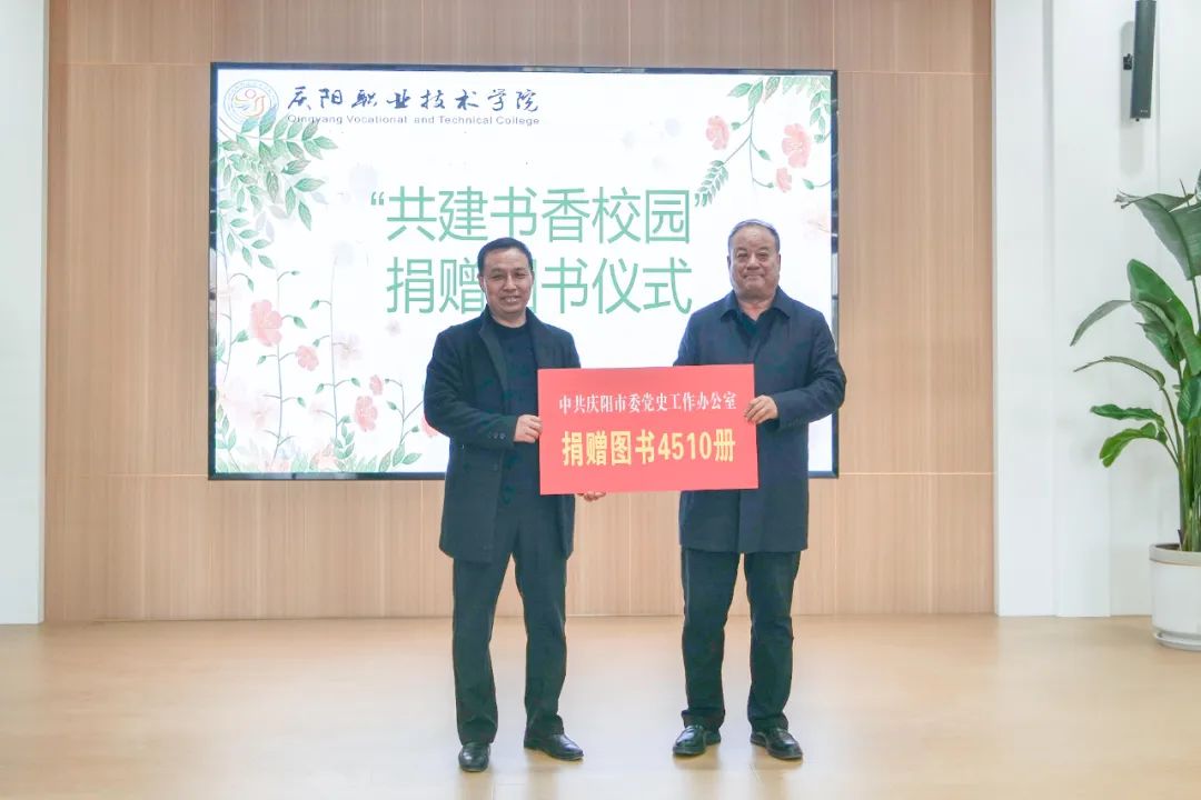为进一步弘扬传承中华优秀传统文化,引领师生好读书、读好书,培育建设书香气质校园,更好地发挥学院图书馆服务师生、服务社会的文化功能,学院于12月初向全体师生、退休职工以及社会各界爱心人士发出了图书捐赠倡议书。倡议发出后,得到了各单位、企业、爱心人士及全院师生纷纷响应。12月29日下午,在学院图书馆文化中心举行了“共建书香气质校园”图书捐赠仪式。中共庆阳市委党史工作办公室陈宗斌、兰州学源理工科技图书有限公司李涛、甘肃英杰图书发行有限公司郭小虎及学院在家班子成员、各部门负责人、师生代表共50余人参加了仪式。党委委员、副院长王婕主持仪式。
