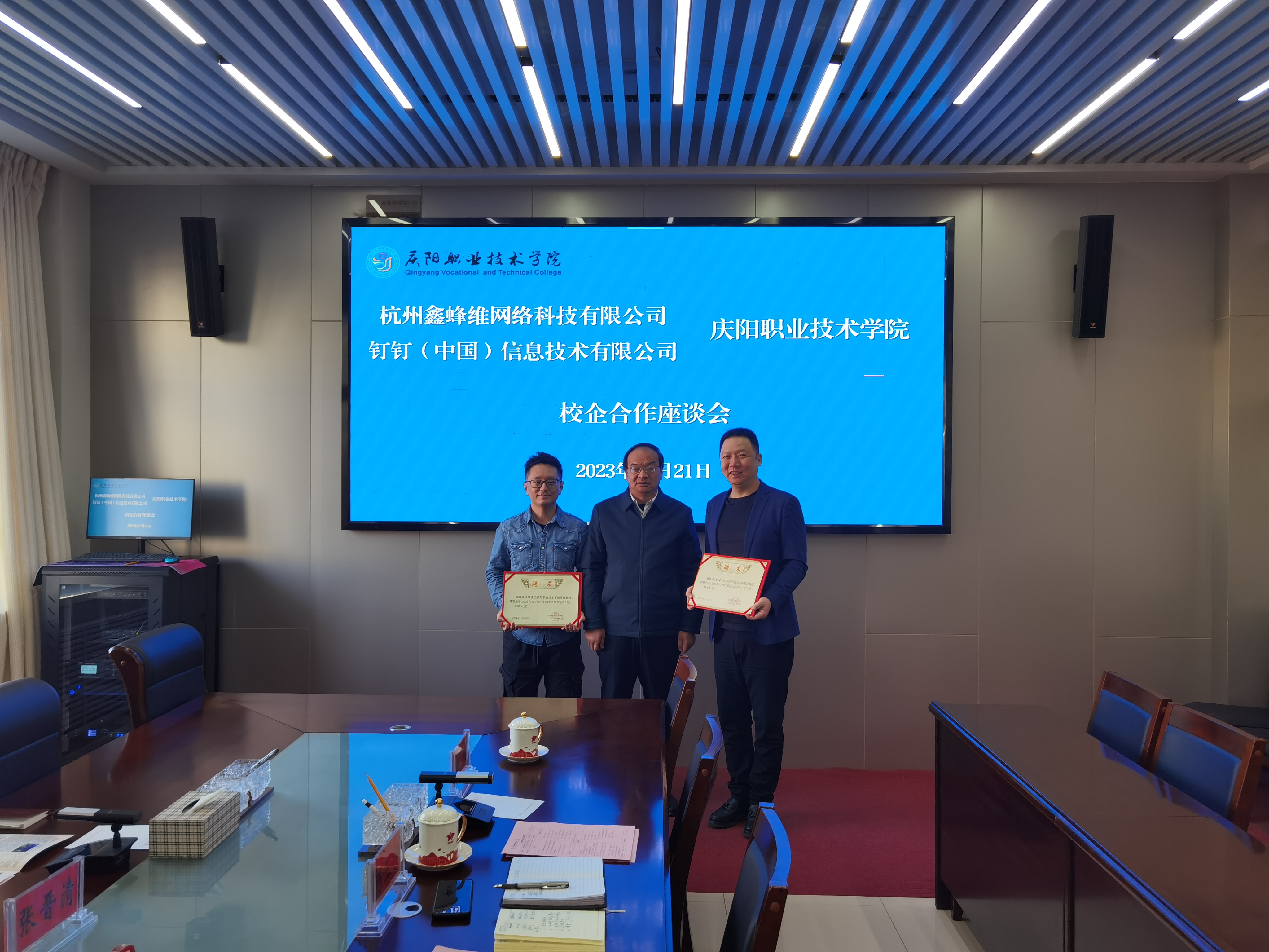 张武德在具体推进工作落实方面强调,一是尽快促使人才基地项目落地,学院有关部门要加强与企业的对接联系,全力以赴配合企业做好数字人才管理师新职业培训认证基地申报工作。二是打造市域数字经济产教联合体,充分发挥甘肃省陇东南职业教育集群和庆阳市职教集团优势,通过整合庆阳市县区中职资源、实现“1+8”组团发展,吸纳全省高等职业院校,共同打造市域数字经济产教联合体。三是做好钉钉数字管理员培训,成人教育培训部门要加强与企业联系,共同制定培训方案,按照市政府关于数字人才培训计划,全力做好各项培训的前期准备工作。四是协同推进产教融合共同体、“钉钉”数字产业学院建设。充分发挥鑫蜂维网络科技公司、钉钉(中国)信息技术有限公司行业资源优势,开展“冠名班”“订单班”培养,开拓实习就业岗位,共同制定数字经济人才培养方案,开发课程体系,为企业量身培养高水平高素质技术技能型人才。五是开展全方位、深层次合作。在师资队伍互聘互培、科研项目研发攻关,专业课程设置开发、文化学术研讨交流等方面开展深度合作,签订校企合作协议,全力推进合作事项落地生根,务实高效。