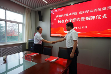 7月23日上午,庆阳职业技术学院与庆阳华钻能源集团校企合作签约暨揭牌仪式在学院树人楼隆重举行。庆阳华钻能源集团有限责任公司董事长李岗、总经理袁佳,学院党委书记张建军,党委副书记、院长白旭宁和双方在家班子成员及党政办公室、教务处、招生就业处、成人教育培训处、智能工程系、能源化工系主要负责人参加。仪式由党委委员、副院长王婕主持。