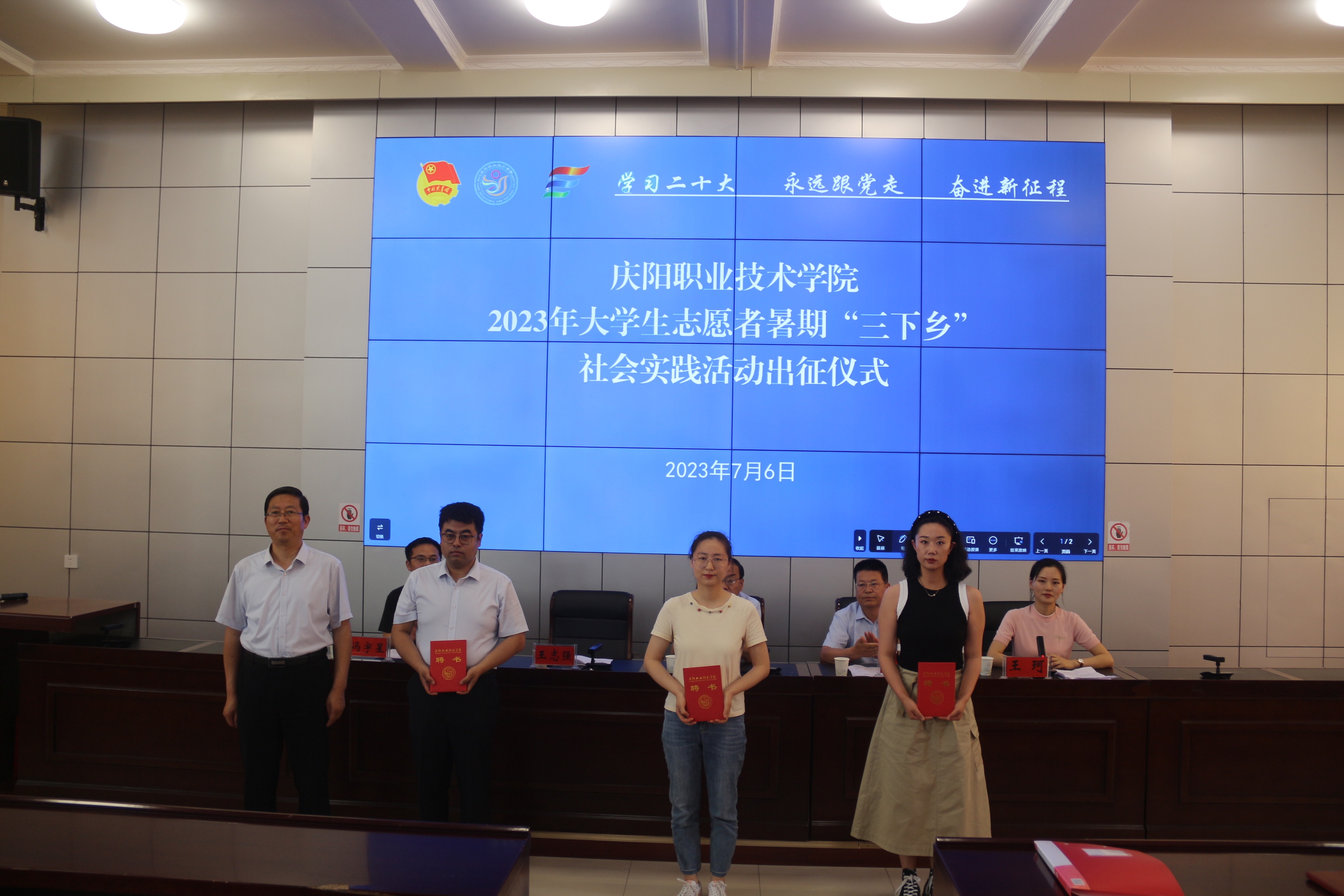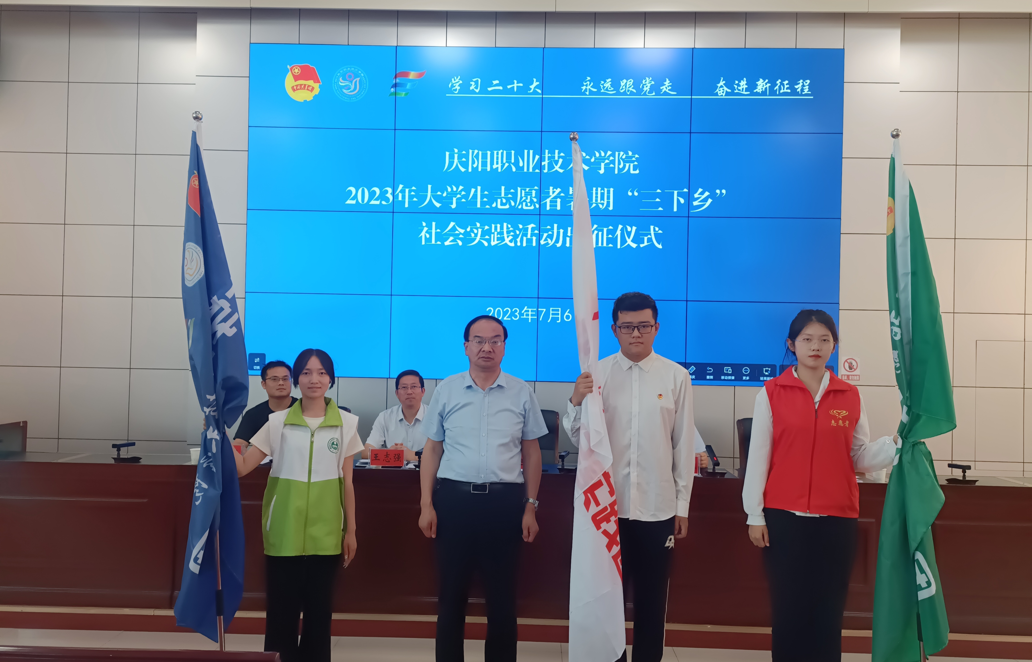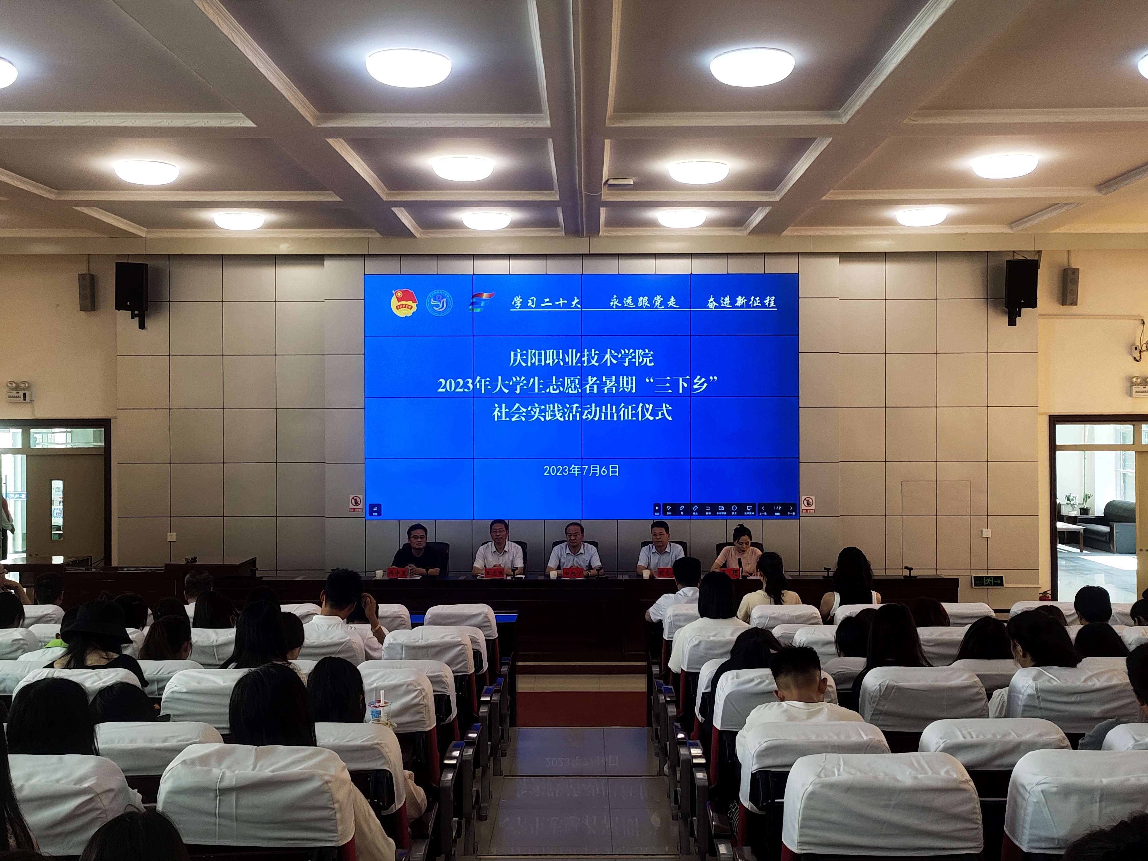 7月6日,“学习二十大 永远跟党走 奋进新征程”庆阳职业技术学院2023年大学生志愿者暑期文化科技卫生“三下乡”社会实践活动出征仪式在学院多媒体报告厅举行。院党委副书记、院长白旭宁、党委副书记胡志玉、党委委员、副院长王志强出席活动,相关部门、各系主要负责人、团总支书记、省级重点社会实践团队全体成员、学生代表共计300余人参加。会议由团委副书记王珂主持。