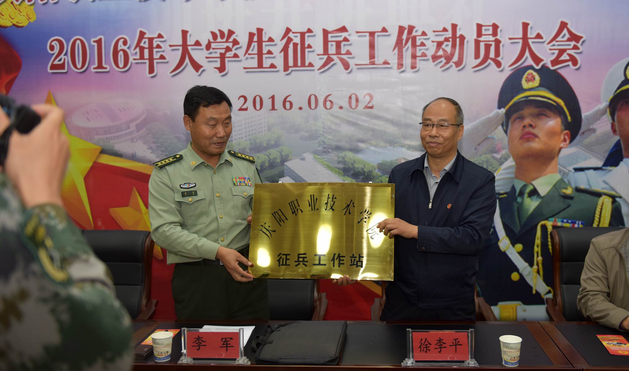 6月2日下午,庆阳职业技术学院征兵工作站揭牌仪式暨2016年大学生征兵工作动员会在学院阶梯教室举行。庆阳市军分区司令员、庆阳市征兵工作领导小组副组长李军、西峰区人武部部长吕伟,学院党委书记徐李平、院长席志慧、...